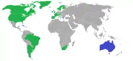 Blue: Water Gray: Never participated in OG Dark Gray: Participated in earlier OG Green: Country participated for the first time Dark Blue: Country participated also on previous games Red: Country boycotted the sailing event of the OG |