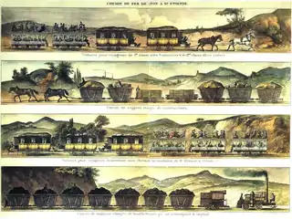 The railway followed the path of the Janon from Terrenoire (now part of Saint-Étienne) to Saint-Chamond, and then the Gier to the Rhone.[3] Between Rive-de-Gier and Givors on the Rhone, the railway paralleled the Givors canal. The population was hostile to the railway which threatened many trades. Trains were derailed and wagons set on fire.[4] In 1835 the proletarian poet Guillaume Roquille published his Franco-Provençal language collection Ballon d'essai d'un jeune poète forézien (Trial balloon of a young Forézien[lower-alpha 1] poet) violently attacked the arrival of the railway, which would ruin the canal on which his father worked as a porter.[5]