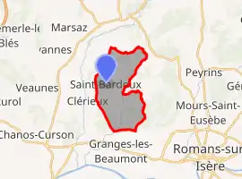 Saint-Bardoux is located 8 km north-west of Romans-sur-Isère (capital of the canton) and 11 km east of Tain-l'Hermitage. The surrounding communities are Clérieux, Saint-Donat-sur-l'Herbasse and Granges-les-Beaumont.