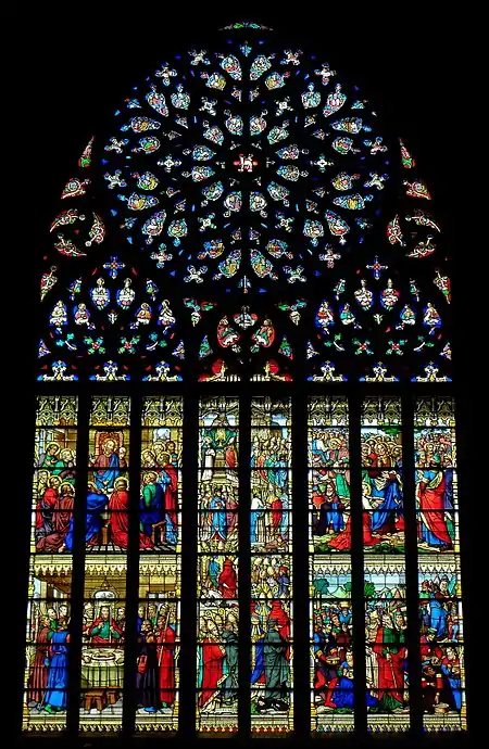 This window is one of the great treasures of the cathedral. A statue of Saint-Yves has been placed on the wall nearby in recent years. It is a 16th-century work and was donated to the cathedral by a family in Chatelaudren.[9] The fenestration itself dates to the 15th-century whilst the 60 metre stained glass window dates to 1863. It concentrates on the theme of the eucharist and the sacrement depicts various biblical stories; manna in the desert, the Feeding the multitude story, the Last supper and the Easter lamb. The two central compartments recall the treaties of Nicée in 325,[10] the Fourth Council of the Lateran in 1215 and the Council of Trent in 1545. Under this window are statues of John the Evangelist and Thomas Aquinas both dating to the 19th century.