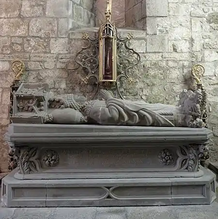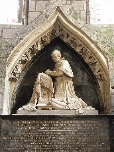 The cathedral contains the tomb of Monseigneur Jacques Jean-Pierre Le Mée who was bishop of Saint-Brieuc and Tréguier from 1841 to 1858 succeeding Monseigneur Le Groing de la Romagère. He was the superior of the "Filles du Saint-Esprit", held a synod for them in 1851, and built a new seminary. He founded Saint-Brieuc's école Saint-Charles, Guingamp's Notre-Dame institute and the Saint-Joseph college at Quintin. He died on the 31 July 1858 at the age of 64.[7] The effigy of Le Mée, kneeling at a prie-dieu was the work of Pierre-Marie-François Ogé and dates to 1859. The tomb stands in an enfeu originally holding the tomb of Jean Prigent who had built the chapel in 1472. This had been destroyed during the French Revolution.[5]