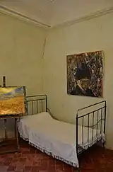 On 8 May 1889, van Gogh voluntarily entered the asylum[10] of St. Paul[11] near Saint-Rémy in the Provence region of southern France.[12] Saint-Paul, which began as an Augustine monastery in the 12th century, was converted into an asylum in the 19th century.[3] It is located in an area of cornfields, vineyards and olive trees at the time run by a former naval doctor, Dr. Théophile Peyron. Theo arranged for two small rooms—adjoining cells with barred windows. The second was to be used as a studio.[13]
