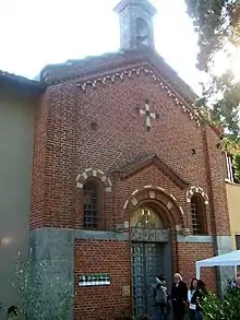 The current appearance of the facade dates back to an 1886 restructuring commissioned by the owner, Ercole Gnecchi.[16] It was rebuilt in brick[22] in the style of Lombardy,[23] in reference to the Basilica of Saint Ambrose in Milan, and is divided by a cornice. The top has a central lunette depicting the blessing of Saint Ambrose, surrounded by a round arch, and next to it there are two arched windows.[15] This section is surmounted by a pediment, and above it there is a small tower.[24] The bottom presents a splayed portal. The lintel is the original one, and depicts an early Christian greek cross with the symbols of the evangelists, Mark and John.[15][23]