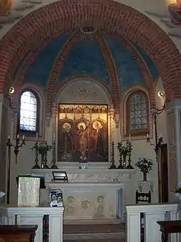 The church is characterized by a small nave with apse,[24] covered by a gable in turn supported by wooden trusses with decorated warping.[15] The flooring is made of terracotta brick, while the walls are painted in a light colored parchment, itself decorated with polychrome socket boxes.[24] Preceding the altar there are a round arch and a tympanum above it, which depicts two angels in prayer. In the tympanum there is an oval inside which is enclosed a radial cross termed Salus Mundi.[23][24] The vault of the presbytery is decorated with a blue sky with gold stars.[15] The presbytery contains an altar made of stone, which is separated from the rest of the church by a balustrade in gothic style and in the same material.