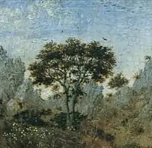 A free copy from some two generations later is in the Prado in Madrid. This is in a vertical format and measures 47 x 36 cm. A large tree is added at the left, and the foreground rocks extended higher. The landscape is somewhat different, and reflects the world landscape style of Joachim Patinir, to whom the painting has been attributed in the past. This was largely because the jagged peaks in the distance have been added to and altered to Patinir's trademark depiction of the distinctive landscape of Dinant, his hometown.[56] This panel was attributed by Max Jakob Friedländer to a "Master of Hoogstraeten", an anonymous follower of Quentin Massys, and dated around 1510.[57] The awkwardness of the figures has been rectified, the placement of his feet and knees "made more rational" according to Rishel, but St Francis stares at the apparition. Another copy, placed tentatively in Brussels c. 1500, is probably a copy of the Turin version.[58]