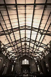 - The exposed timber trusses form a pattern on the ceiling. The trusses are held together with thin steel ties.