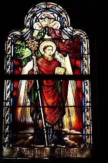 Hadelin is especially venerated in the Walloon diocese of Namur, as founder of the monastery of Celles. He is the patron of Celles, where he is celebrated on the Sunday following the Nativity of the Blessed Virgin (September 8).[2] A silver-made shrine in the Mosan style, can be found in Visé, Belgium.[5] Hadalinus is invoked against children's ailments; in iconography his attribute is a dove.