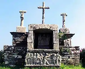 The enclos paroissial calvary is 6 metres high and was erected in around 1530. It is thought to have been executed by the workshop who carved the calvary at Brasparts. The base incorporates an altar suggesting that the calvary was at one time used for open air services. The pedestal placed on this base is rectangular and from it emerge the crucifixion cross and two tau shaped gibbets, and at the base of these there is a 'Vierge de Pitié" or pietà carved from kersanton stone featuring the Virgin Mary supporting Jesus' body assisted by Mary Magdalene and John the Evangelist. On the central shaft bearing the crucifixion cross there is a relief carving of Saint Michael slaying the dragon and at the top of the shaft is an arrangement including depictions of three marmousets (small grotesque carvings) who support statues of the Virgin Mary (on the right) and John the Evangelist (on the left). Both these statues are in ronde bosse. The figure of Jesus is carved from granite and is in high relief whereas the good and bad robbers on the two side gibbets, their bodies contorted, were carved from kersanton stone.[4][5][6][7]
