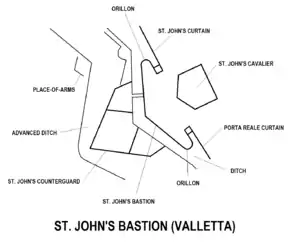 ![]() Map of St. John's Bastion with its cavalier and counterguard | |