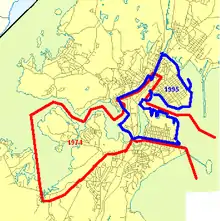 ![]() The boundaries of the original Saint John Harbour (red) overlaid with the boundaries of this district as it stood from 1995 to 2006 (blue) | |