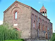 Catholicos Gevorg IV began reconstruction efforts in 1868.[4] He successfully raised funds to reconstruct the church. In 1872 he officially called upon the Armenian people to support the cause in a kondak (proclamation or encyclical).[18][19] Reconstruction works began in the spring of 1873 and were completed in 1879.[20][6] The church was built by Greek workmen from Alexandropol.[4] The new church was consecrated on October 21, 1879.[6][21] The new church is a vaulted basilica built in black tuff.[6][11][22] It has three entrances on the north, south, and west and eleven windows, not including the smaller windows on bell-tower.[22] It has a capacity of 800 people.[21] Acharian described it as a "mid-sized building, much more beautiful than usual rural churches, but lesser than churches of large cities."[20]