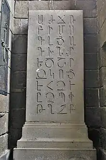 The church underwent extensive renovation in the 1960s, during the reign of Catholicos Vazgen I, through the financial support of Hayk and Torgom Ghazarosian brothers of Milan, Italy,[26][6][27] originally from Yerznka.[28] A monument depicting the original 36 letters of the Armenian alphabet, as created by Mashtots, in the erkatagir style, was erected near the entrance to the grave of Mashtots. It was designed by Baghdasar Arzoumanian.[26] The floor of the church was covered with basalt tiles.[22] A wall with a length of 310 metres (1,020 ft) was built around the church in tuff.[22] A drinking fountain designed by Rafael Israelyan was erected at the church courtyard in 1964.[6]