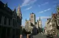 St. Nicholas Church (Dutch: Sint-Niklaaskerk) is one of the oldest and most prominent landmarks in Ghent, Belgium. Begun in the early 13th century as a replacement for an earlier Romanesque church, construction continued through the rest of the century in the local Scheldt Gothic style (named after the nearby river). Typical of this style is the use of blue-gray stone from the Tournai area, the single large tower above the crossing, and the slender turrets at the building's corners.