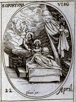 In art, Saint Opportuna is often depicted carrying an abbess's crozier and a casket of relics. She may also be shown with the Virgin appearing at her deathbed or as a princess with a basket of cherries and a fleur-de-lys.[3]