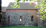 The oldest part of the church was built in the romanesque style in the 12th century from stone. The lower walls of the nave still show the church's original stone, which transitions into the brick added by later renovations. In the early 14th century, two additions to the church added a choir on the eastern side of the nave and a church porch. Later in the 14th century, a second chapel was added to the south so that the floor plan of the church resembled a cross. At the same time, the ceiling was reconstructed to include vaults. The sacristy was built in the early 16th century and had vaulted ceilings to match the renovations to the nave.