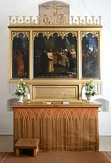 The altar was constructed from brick. During the 19th century a relic was found encased in a vault of the altar that has since become part of the National Museum's collection. The church's first altarpiece was replaced by one from Antvorskov when the monastery was demolished. The altarpiece was again replaced in 1882 with a piece by August Jerndorff which is still in use today. It is divided into three fields which depict the denial of Peter, the Sanhedrin trial of Jesus, and the repentance of Peter. A side altarpiece is hung to the north of the choir, which dates back to the 14th century. The side altarpiece depicts Saint Dionysius of Paris. Because Saint Dionysius was martyred after being decapitated, he is often depicted carrying his own head in his hands, but in this illustration only the top of his mitre has been cut off. The granite baptismal font is from the 13th century and is carved from an unusual octagonal shape, which suggests that it was original made for another purpose. This theory is supported by the fact that it came from Antvorskov monastery, which would not have performed baptisms. The brass dish inlaid in the font is from the 17th century.