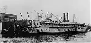 The boat was built by the Dravo Contracting Co. of Pittsburgh, Pennsylvania in 1932. She was Hull #1139 and weighed 947 tons.[2] The Sainte Genevieve had a steel hull and a superstructure of wood with steel for strengthening. Between 1963 and 1973, 97% of her hull bottom and 71% of her sides were replated.[3] Her paint scheme of gray and ivory with trim colors of dark red, black and gray was consistent[sissippi River]] to keep it open to barge traffic.[4] She was the last sternwheel vessel and the last steam-powered dredge operated by the Corps when she retired in 1984.[3] She was given to the city of Davenport for use as a tourist attraction. Plans were to turn her into a dockside restaurant, a floating museum, or a bed and breakfast. Those plans were never realized, and she left Davenport in October 1990 for a new home on the Missouri River in St. Charles, Missouri, where there were plans to turn her into a museum, but that plan never materialized. The Sainte Genevieve sank in 1992 near Cairo, Illinois. She was raised and sank again in Cape Girardeau, Missouri in 1994. She was reportedly scrapped.[4] The vessel was delisted from the National Register of Historic Places in 2019.[5]