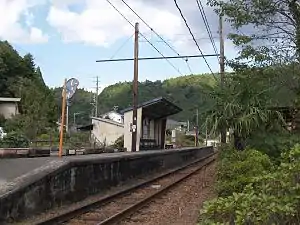 The station has one side platform serving a single track, connected to a small wooden station building. The station is unattended.