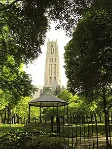 ![]() Looking downtown, the gazebo in the foreground and the tower of Riverside Church behind it | |