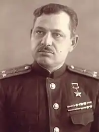 Salahaddin Hasan oglu Kazimov (Azerbaijani: Salahəddin Həsən oğlu Kazımov; 22 December 1920 – 2 July 1978) was an Internal Troops Major general and a Hero of the Soviet Union. Kazimov was awarded the title Hero of the Soviet Union on 16 October 1943 for his leadership of an artillery battalion during the Battle of the Dnieper. In a twelve-day period during the battle, his battalion's guns were reported to have killed up to 180 German soldiers and destroyed eleven tanks. Postwar, Kazimov served in the Internal Troops and became Deputy Minister of Internal Affairs of the Azerbaijan SSR. Kazimov and Minister of Internal Affairs Arif Heydarov were shot by an officer of the Shusha prison.[1] He was wounded in an armed attack on the Ministry of Internal Affairs of the Azerbaijan SSR and died on July 2, 1978.[2]