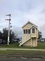 The original site of Sale station is now the Gippsland Centre Shopping Centre, although the signal box, level crossing gates, and two semaphore signals are statically preserved in situ.[6] To the west of the station, the Sale Industrial Sidings remain in place but unused, as do the goods sidings.[6] The sidings across from the platform were regularly used to allow Bairnsdale to Geelong log trains to cross passenger services, but log trains have ceased running.