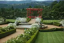 It includes the 17th century Eyrignac Manor (French: Manoir d'Eyrignac), which has a remarkable garden, originally established in the 18th century, surrounding the manor house on a hill, with water coming from seven springs. Only a pavilion, fountains and basins remain from the original garden. In the 1960s, the new owner, Giles Sermadiras de Cuzols de Lile, created a new garden, inspired by gardens from the Renaissance and Italian gardens to the end of the 18th century. The garden features topiary sculptures, vistas, fountains, statues, and an avenue of vases.[2][3]