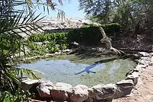 There are two primitive soaking pools fed by Palm Spring. The Wizard Pool is one of the hottest thermal springs in the Saline Valley with temperatures between 105°F and 112°F. The three and-a-half foot diameter hexagonal soaking pool was built in the 1980s from rock and concrete. Seating has been built surrounding the pool. The Volcano Pool has a cooler temperature than Wizard pool, and is also contructed from rock and concrete and is above ground, whereas Wizard is below ground. Volcano is 15 feet across, with temperatures ranging from 98°F to 104°F.[2]