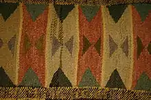 Some red inclusions, found in some blankets, may be made of wool fabric and were used by the Salish weavers in the last quarter of the 1800s. Strips were torn from imported blankets or other materials and used in weaving. It is likely that the introduction of these foreign materials into the weaving was based on colour; strips of richly dyed fabric are common in the later plain or solid style Salish blankets while brightly coloured commercial yarns are included in many of the decorative blankets. In most cases the introduced fabric strips and yarns use colours not available through native plant or mineral dyes.[2]
