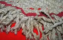 Sheep's wool, or mah-too-EHL-kel, is the most common material used for modern Salish weaving. Some knitters still buy shorn fleeces and go through most of the traditional preparation, but most buy the washed and carded wool directly from a commercial carding mill.[7] The fleece is lightly washed in a tub of tepid water and then hung outside to dry. It is then teased or picked apart with fingers to remove any matted areas and loose dirt. The wool is then carded, leaving the wool in soft batts, where the fibers lie lengthwise. Taken to the spinning machine, the wool is deftly hand fed into the axle of the spindle. This separates sections of the batt of wool and allows the desired amount of spinning to take place before the tension is eased to wind the wool onto the spindle. When the spindle has filled, the wool is unwound and stored in balls or skeins.[5]