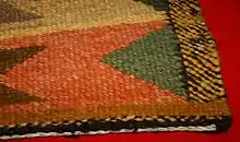 This type of weave, called SWOH-kwah-'tl, is used in the production of the largest blanket styles. The warp and weft are usually of the same material. The weft crosses the warp over two, under two, or over two, under one. At the edge the weft is turned back and woven across in the opposite direction. The order of crossing the warp is changed as each line is woven - it is stepped along one warp, but the system of over two, under one is continued throughout the weave.[5]