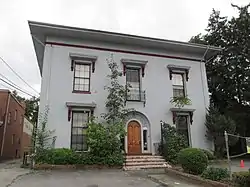 It was built in 1860 for prosperous local businessman Salmon Washburn, who ran a furniture, housewares and hardware business on Main Street.[2] The two-story house is built on a square plan with a low-pitch hipped roof and very broad cornice. Dominating the stucco façade is a bold, semi-circular-arched doorway inset with an elaborate cast-iron screen, cast in foliate pattern, in the transom area. The windows are capped by large decorative drip moldings.