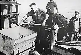 Japanese workers were prized for their ability to repair boats, as well as their skills as fishermen.[13] These skills placed them in direct competition with European and First Nations fishers.[18] Due to the nature of the jobs they performed, Japanese men were not seen as feminine, as the Chinese tended to be viewed. Although they were still segregated from other workers, they were paid more, and they were higher on the social scale. The Japanese played an important role in canneries until World War II, when many Japanese men were interned for the duration of the war. At this time, many of their fishing vessels were also confiscated, making returning after the war difficult for them.[19] Despite this treatment, many Japanese men did return to cannery life in the aftermath of the war, though the return was slow, and was not welcomed by all.