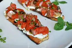 Salmon tartare is prepared with fresh raw salmon and seasonings.[1] It is commonly spread on a cracker[2] or bread[3] and eaten as an appetizer.