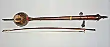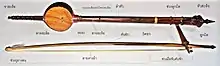 Saw lo (สะล้อ), rear view, showing the sound hole and the neck of the instrument going through the sound-box, a feature of the larger spiked-lute family.