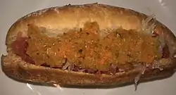 ![]() A Chilean completo topped with tomato, sauerkraut and salsa americana (Pickles, Pickled Carrot and Pickled Onion). | |