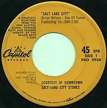 "Salt Lake City" was written to call attention to the band's major fan base in the city of the same name. From 1963 until 1973, The Beach Boys performed at Utah's Lagoon Amusement Park's Patio Gardens at least twelve times, and Utah was one of the earliest places that The Beach Boys' music was played outside of California.[1] KNAK deejay Gene Davis said, "[Brian Wilson] remembered coming to Salt Lake, but it was not a big deal. When you talk to Mike Love, Salt Lake was big time to them. He loved Salt Lake City. But [Wilson] remembered writing 'Salt Lake City' as one of those fun songs they sat down and did."[1] The song was also released as a promo single, backed with "Amusement Parks U.S.A.", by the city's downtown merchants association.[2]