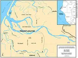 Historical land reclamation activities for agriculture, including tide gates and levees as well as siltation from uphill landslides and erosion, slowly filled in the river over time, reducing the watershed by 42 percent.[9] Most of the original vegetation and trees were gone by 1900, leading to an increase in siltation and a shallowing of the river. In the ten years spanning 1889 to 1899, the river depth changed from 20 feet (6.1 m) to 2 feet (0.61 m).[8]: 1 Logging in the Wildcat hills continued and intensified following World War II, leading to construction of logging roads and exposed slopes, producing additional siltation.[6] Siltation continued; by 1949, the Salt River had become so shallow that "at low tide... parts of it can be waded across by a man with hip boots."[7] After the catastrophic 1964 flood, nearly 13,000 acres (5,300 ha) had been covered by sand or silt.[6] In 1967, residents built a levee cutting off the flow of water from the Eel into the Salt,[6]: 17 which prevents the Eel River from spilling over into the Salt channel during high water, and facilitating sediment removal.[5] Without the occasional overflow from the Eel, plus the 1964 sediments, and the addition of landslide sediments from the 1992 Cape Mendocino earthquakes,[6] by 2008 the river had become mostly dry land.[7] During the 1970s, the California Department of Fish and Game stopped farmers from clearing out local channels; willows and brush quickly filled in the riverbed,[6] and caught sediment, stopping nearly all the flow in the lower half of the Salt, leading to flooding, problems with dilution ratios at the Ferndale Water Treatment Plant, and water quality in general.[9]
