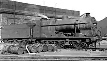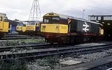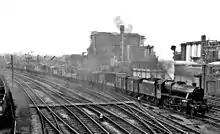 Saltley station was the site of a large roundhouse motive power depot established by the Midland Railway in 1868. This was doubled in size in 1876, by the addition of a second roundhouse, and a third was added in 1900.[4] The depot was re-roofed by British Railways in 1951, but closed on 6 March 1967 and was later demolished. The shed yard was used for stabling diesel locomotives until at least 1999.[4] Under the London Midland and Scottish Railway and British Railways Saltley had the shed code 21A. As a diesel stabling depot it was SY.