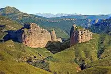 Salto de Roldán includes two main rocky outcrops: Peña San Miguel (sometimes Sen; English: 'St Michael's Rock' or 'Crag'; 1,126 m (3,694 ft)[1] or 1,123 m (3,684 ft)[2][3]) to the west and Peña Amán (sometimes Men; etymology uncertain; 1,121 m (3,678 ft)[1] or 1,124 m (3,688 ft)[2][3]) to the east. Their exterior sides are sloped, and their facing sides are steep and stepped. They rise 250 metres (820 ft)[4] or over 300 m (980 ft)[5] from the surrounding landscape.[lower-alpha 1] The distance from peak to peak is about 700 m (2,300 ft). There is a smaller isolated outcrop, El Fraile or Mallo d'o Fraile ('The Friar'; 1,036 m (3,399 ft)[lower-alpha 2]), about 500 m (1,600 ft) northeast of Peña San Miguel. The river Flumen flows from north to south between El Fraile and Peña San Miguel to the west and Peña Amán to the east.[1][3][5]