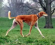 The Saluki, also known as the Persian Greyhound,[2] is a standardised breed developed from sighthounds – dogs that hunt primarily by sight rather than scent – that was once used by nomadic tribes to run down game animals.[3] The dog was originally bred in the Fertile Crescent.[1] The modern breed is typically deep-chested and long-legged,[3] and similar dogs appear in medieval and ancient art. The breed is most closely related to the Afghan hound, a basal breed that predates the emergence of modern breeds in the 19th century,[4] and the Saluki has been purebred both in the Middle East, including by royalty, since at least that era, and in the West (especially in Britain and Germany) since the 1840s (with breed standards established in the West and the Middle East around the 1920s–1930s), though as a free-breeding landrace, similar dogs are common as feral animals in the Middle East. A related standardised breed is the north African Sloughi.