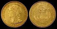 The first decimal Salvadoran coins were issued in 1889. These were copper-nickel 1 and 3 centavos.[1] On August 28, 1892, the Salvadoran mint was established and production of silver and gold coins denominated in centavos and pesos began. In addition to copper 1 centavo coins, there were silver 5, 10, 20 and centavos and 1 peso, and gold 2½, 5, 10 and 20 pesos,[2] although the gold coins were only issued in very small numbers (597, 558, 321, and 300 respectively.[2] In 1909, bronze ¼ real coins were issued in response to the continued use of the real currency system in parts of the country. Coins for 25 centavos were introduced in 1911. Production of silver coins was suspended in 1914.