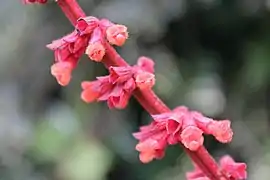 The dark green leaves, with a yellow undertone, are about 7 in (18 cm) long by 3.5 in (8.9 cm) inches wide, with serrated edges, and with velvety red-brown hairs on the petiole and stem of the new leaves. The leaves bear a sage scent. The inflorescences reach up to 2 feet long and are covered with velvety red-brown hairs, with the stems of the inflorescence and the calyx also having a red-brown color. The 0.5 inch flowers are orange-red, and very profuse, explaining the epithet confertiflora, or "crowded with flowers". The plant grows so large that it needs staking and protection from wind in gardens.[2]