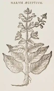 Earlier mentions of the plant are scattered and unreliable. Prospero Alpini described a plant (Marum aegyptium) in his De Plantis Exoticis Libri Duo (1627) that might be S. tingitana, based on his description and Jean-Baptiste Lamarck's listing (in 1805) of Marum aegyptium as a synonym for S. foetida, itself a synonym for S. tingitana. In 1690, Rivinus published a drawing of a plant named Horminum tingitanum (pictured), which was the first time the name tingitana was associated with Salvia. Since Rivinus' herbarium no longer exists it isn't possible to confirm that his specimen was S. tingitana.[7]