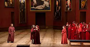 In 2010, the opera Dionysos by Wolfgang Rihm who compiled for his own libretto texts from Nietzsche's Dionysian-Dithyrambs premiered. Alexander Pereira succeeded Flimm as intendant, who departed in 2011 to become director of the Berlin State Opera. Pereira's objective for the festival was to present only new productions.[8] When he resigned at the end of the 2014 festival season to take over as the General Director of La Scala, Sven-Eric Bechtolf, who had served as Drama Director of the Salzburg Festival since 2012, took over as Interim General Manager. The 2015 festival marked the first one for which Bechtolf was responsible for the artistic programming. Budget cuts led to a retreat from Pereira's "new productions only" objective.[9] The 2015 opera program presented only three new productions—Le nozze di Figaro, directed by Bechtolf; Fidelio, directed by Claus Guth; and Wolfgang Rihm's rarely performed Die Eroberung von Mexico (The Conquest of Mexico), directed by Peter Konwitschny.[10] The remaining four opera productions—Norma, Il trovatore, Iphigénie en Tauride, and Der Rosenkavalier—were revivals. In 2018, Lydia Steier was the first woman to stage Die Zauberflöte.[11]