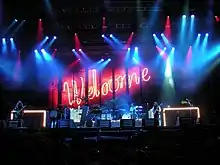 ![]() Lead singer Brandon Flowers gestures towards the crowd during the Killers' 2018 Bonaroo performance. Behind him is touring bassist Jake Blanton and touring keyboardist Robbie Connolly. | |