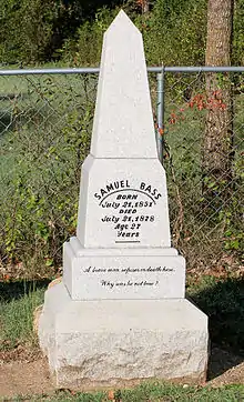 Bass was later found lying in a pasture west of Round Rock[1] by Williamson County Deputy James Milton Tucker. More specifically, Bass had to call out to the posse as they were about to ride by him, shouting, "Hey I'm over here. I'm Sam Bass, the one you are looking for." He was taken into custody and died the next day on July 21, 1878, his 27th birthday.[2][1] Bass was buried in Round Rock in what is now known as Round Rock Cemetery.[1] His grave is now marked with a replacement headstone—as the original suffered at the hands of souvenir collectors over the years. What remains of the original stone is on display at the Round Rock Public Library.