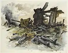At the start of World War Two Black enlisted in the Royal Scots Fusiliers and was commissioned as an officer. He went on to become a camouflage officer, training soldiers in personal concealment and in the protection of defensive positions. Later in the war he became the first commander of a newly established Camouflage School. After seeing action in France, Belgium and Germany, Black ended the war as a major with several decorations.[1] At the beginning of the war Black had written to the War Artists' Advisory Committee, WAAC, offering his services as an artist and asking for facilities. His application was supported by Muirhead Bone and by the end of the conflict WAAC had acquired five paintings from Black, which are now in the collection of the Imperial War Museum.[4]