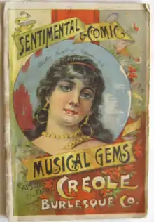 Sam T. Jack produced The Creole Show between 1890 and 1897. It represents a stage in the transition from the traditional minstrel shows to the vaudeville revue.[10] It is said that Sam Lucas came up with the idea of a creole burlesque company, and persuaded Sam T. Jack to put it on.[11] It was the first to present beautiful black women as chorus girls in place of the traditional all-male chorus.[12] It has been called the first black burlesque show. It included original songs, sketches and comedy numbers by black artists.[10]