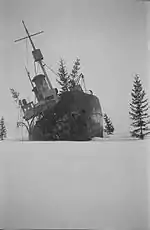 While waiting for the spring thaw, Sampo was camouflaged with tree branches to resemble a small island. This was not very successful, because during the last weeks of the Winter War the Soviet bombers made several attempts to destroy the ship. However, despite dropping at least 250 bombs on the grounded icebreaker the enemy pilots never scored a hit.[22]