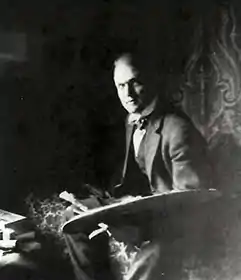 Baker opened his own studio in Boston in 1910.[3] His early work consisted primarily of portraits of society women, educators and musicians, including a 1910 painting of his former teacher Ernest Lee Major, which was exhibited in Boston, New York, Philadelphia and Chicago, later joining the collection of the Smithsonian American Art Museum.[4] Following a 1910 exhibition of 10 of his portraits at Copley Gallery in Boston, he was commissioned to do portraits for the Harvard University Law School, the Massachusetts and New Hampshire state legislatures, and others.[3] In 1916, he moved into Fenway Studios, where many of Boston's leading artists worked.[5] Best known as a portrait artist, he would expand his range around this time to include figure painting, landscape, cityscape and still life.[2][3] During World War I, he designed American Red Cross and Liberty Loan posters for the US government.[6]
